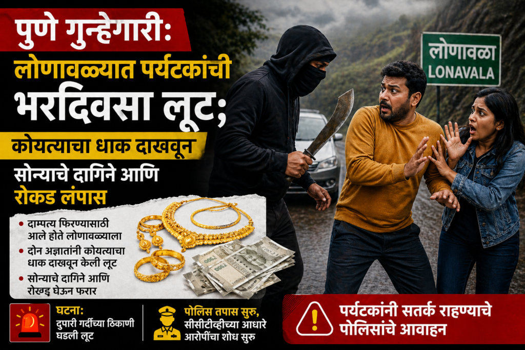 लोणावळा (pragatbharat.com) : पर्यटनासाठी प्रसिद्ध असलेल्या लोणावळा परिसरातील लायन्स पॉईंट जवळ एका पर्यटक कुटुंबाला कोयत्याचा धाक दाखवून लुटल्याची धक्कादायक घटना समोर आली आहे. भरदिवसा घडलेल्या या प्रकारामुळे पर्यटकांच्या सुरक्षेचा प्रश्न पुन्हा एकदा ऐरणीवर आला असून, परिसरात घबराटीचे वातावरण पसरले आहे.