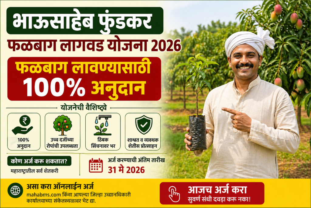 छत्रपती संभाजीनगर (pragatbharat.com) : पारंपरिक शेतीला फळबागेची जोड देऊन शेतकऱ्यांचे उत्पन्न दुप्पट करण्याच्या उद्देशाने महाराष्ट्र शासनाने ‘भाऊसाहेब फुंडकर फळबाग लागवड योजना’ २०२६-२७ या वर्षासाठी नव्या जोमाने राबवण्याचा निर्णय घेतला आहे. या योजनेंतर्गत अल्प व अत्यल्प भूधारक शेतकऱ्यांना फळबाग लागवडीसाठी खड्डे खोदण्यापासून ते रोपे लावण्यापर्यंतच्या खर्चावर १००% अनुदान दिले जाते.